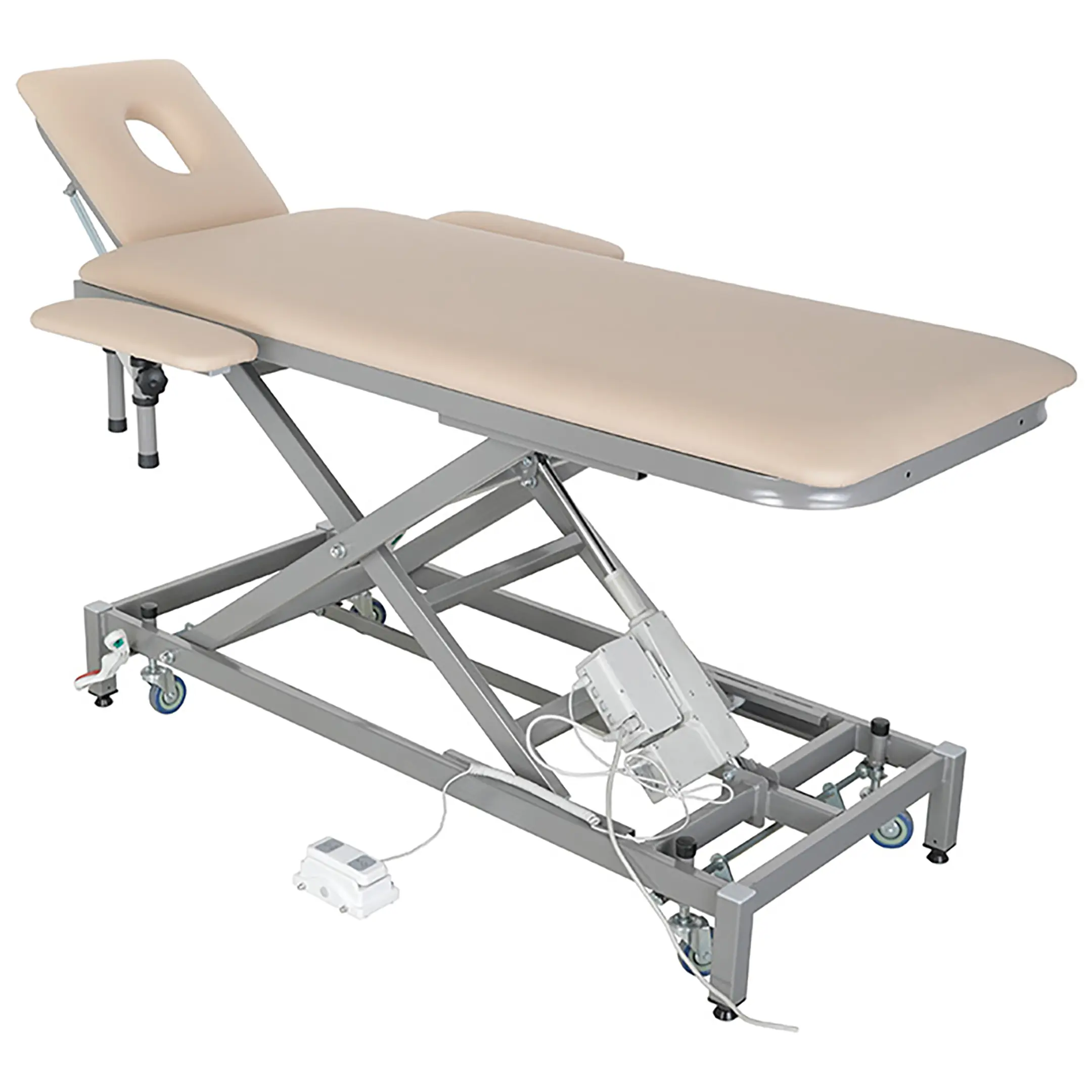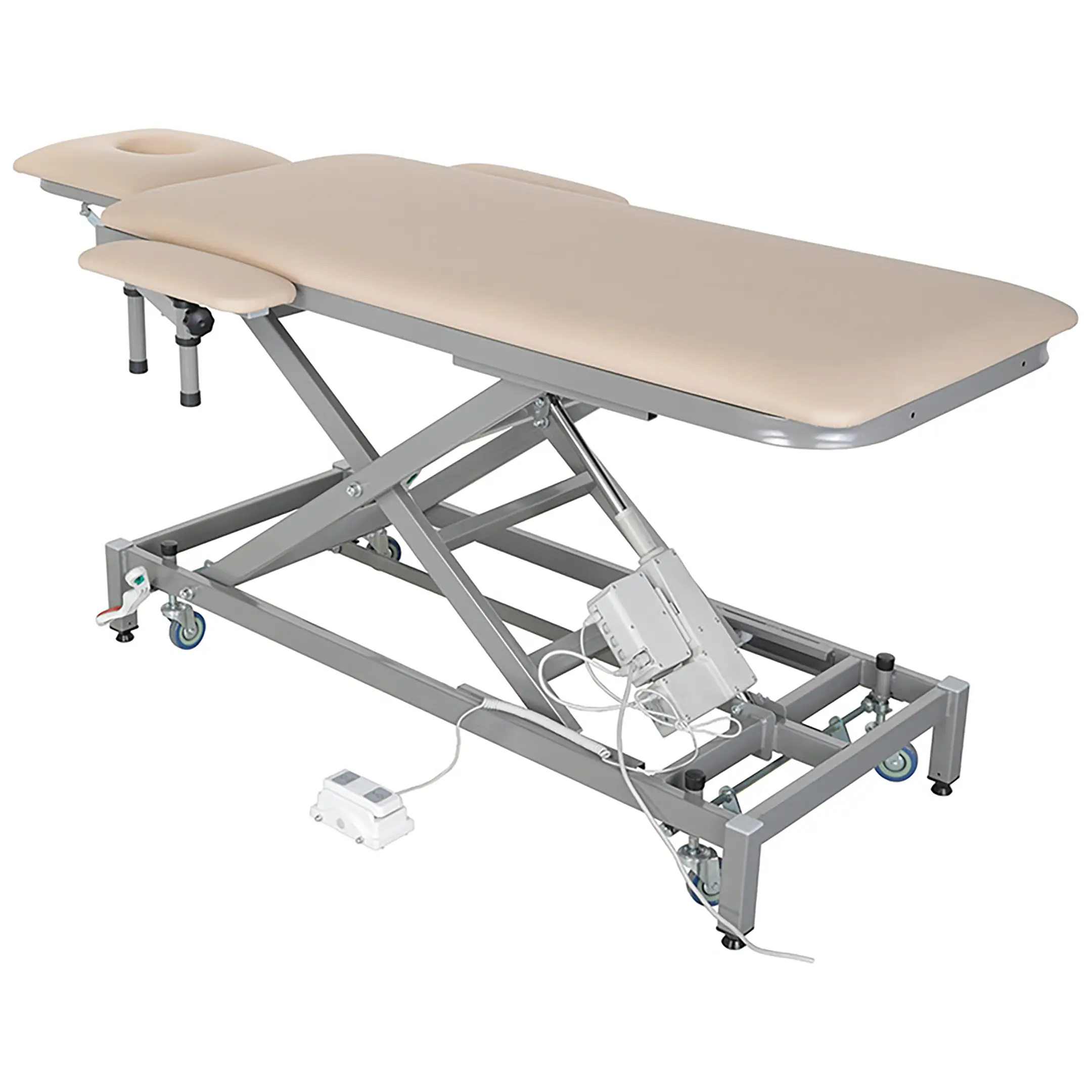 • массажный стол установлен на 4 регулируемые опоры с возможностью перехода на самоориентирующиеся колеса, ∅ 75 мм, из немаркой серой резины, не оставляющего следов на полу для перемещения стола;