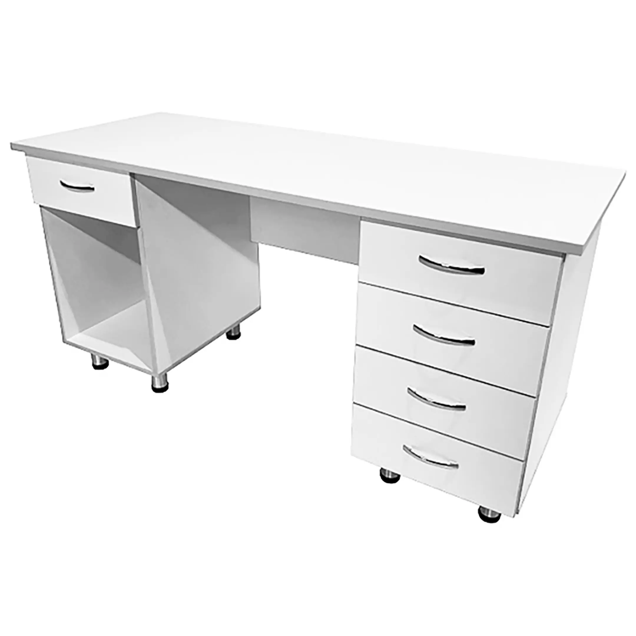 • Одной из особенностей этого стола является его конструкция с двумя боковыми тумбами. Одна тумба оснащена выдвижным ящиком и нишей, а вторая - четырьмя выдвижными ящиками, что обеспечивает удобное размещение и хранение различных предметов и документов. Отличительной чертой модели является белый цвет ЛДСП с кромкой светло-серого оттенка, придающий столу современный и профессиональный вид.