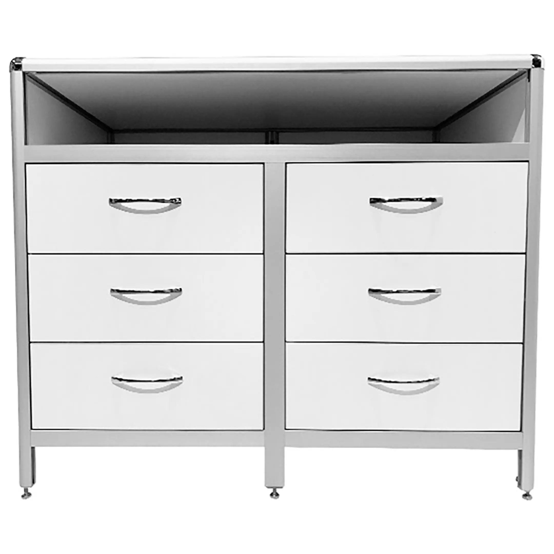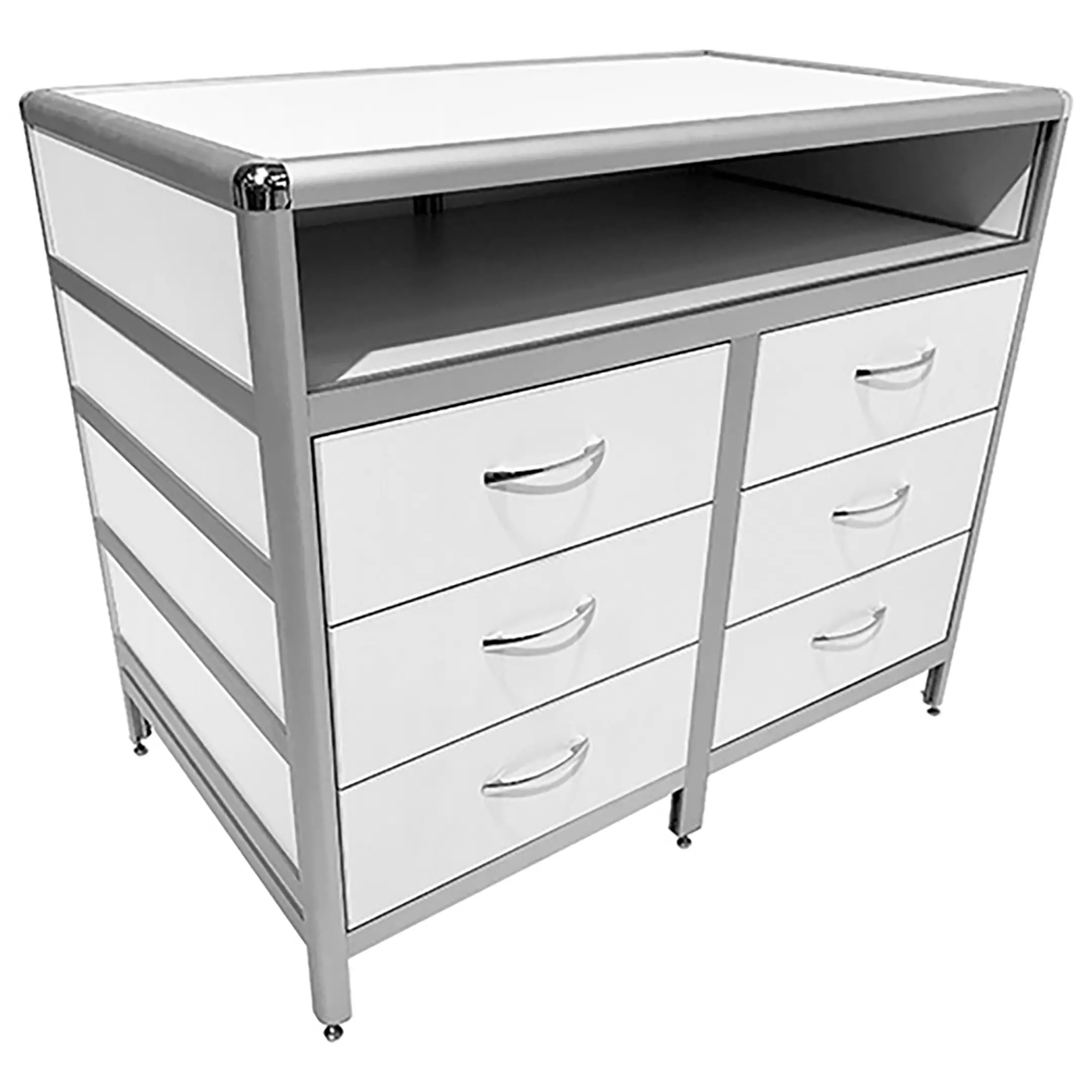 Стол-тумба лабораторная MED 12.013al (белый) — это функциональное решение для хранения лабораторного инвентаря и оборудования в лабораториях и медицинских учреждениях. Модель оснащена просторной нишей под столешницей (940х540х139 мм) и двумя вертикальными рядами выдвижных ящиков (всего 6 штук) размером 434х70х406 мм. Каркас выполнен из алюминиевого профиля, столешница из ЛДСП толщиной 16 мм.
