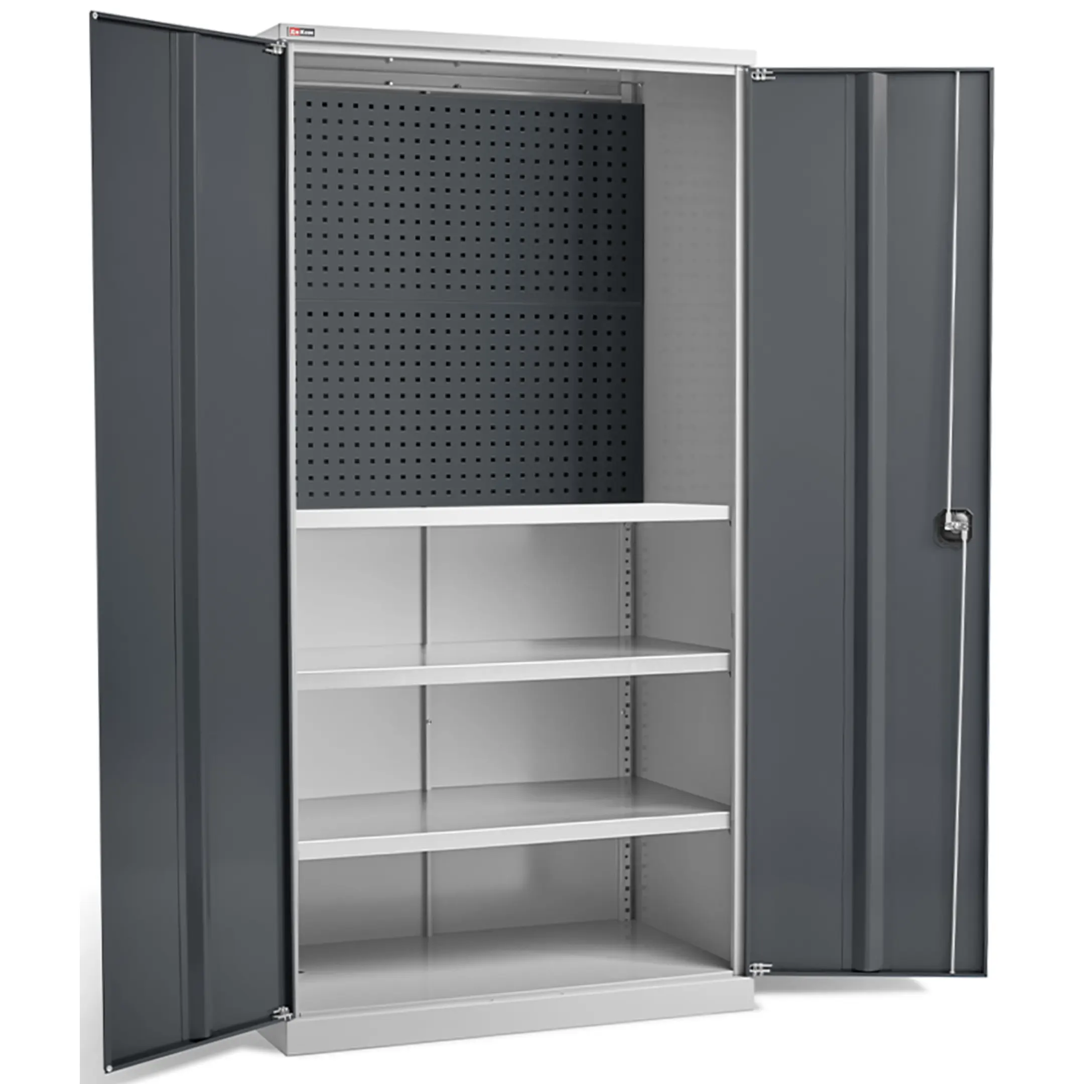 - Наглядная организация и быстрый доступ — шкаф оборудован перфорированными панелями (система «перфо») на внутренних поверхностях, которые позволяют размещать инструмент с помощью крючков и держателей. Это обеспечивает мгновенный визуальный контроль наличия всех предметов, ускоряет процесс работы и помогает поддерживать идеальный порядок.