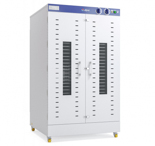 Шкаф сушильный ШС-32-2Г-01 позволяет в промышленных объемах сушить травы, зелень, фрукты, овощи, ягоды, орехи, грибы, макаронные изделия, а также готовить пастилу, йогурт, вяленое мясо и рыбу, основы для сыроедческих пицц, тортов, пирогов и другие сыроедческие блюда (фруктовые чипсы, хлебцы, козинаки, конфеты, печенье и пирожные) на предприятиях общественного питания и торговли, а также на фермах и сельскохозяйственных предприятиях. 8 вентиляторов, расположенных на задней стенке обеспечивают горизонтальный обдув продуктов - поток воздуха движется от задней стенки по направлению к двери, равномерно прогревая продукт, тем самым обеспечивая быструю и равномерную сушку/приготовление продуктов, при этом не смешивая запахи продуктов на разных уровнях