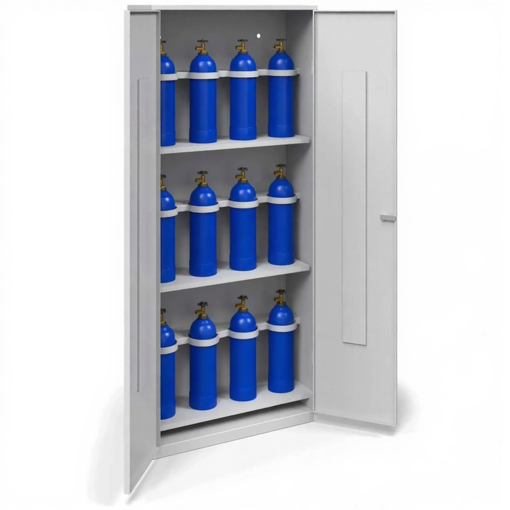 - Обеспечение высочайшего уровня пожарной и промышленной безопасности — хранение горючих, окислительных или инертных газов требует особых мер. Шкаф изолирует рампу от источников огня, искр, масел и жиров. Система естественной вентиляции предотвращает опасное накопление газа в замкнутом объеме, что критически важно для предотвращения пожаров, взрывов или удушья.