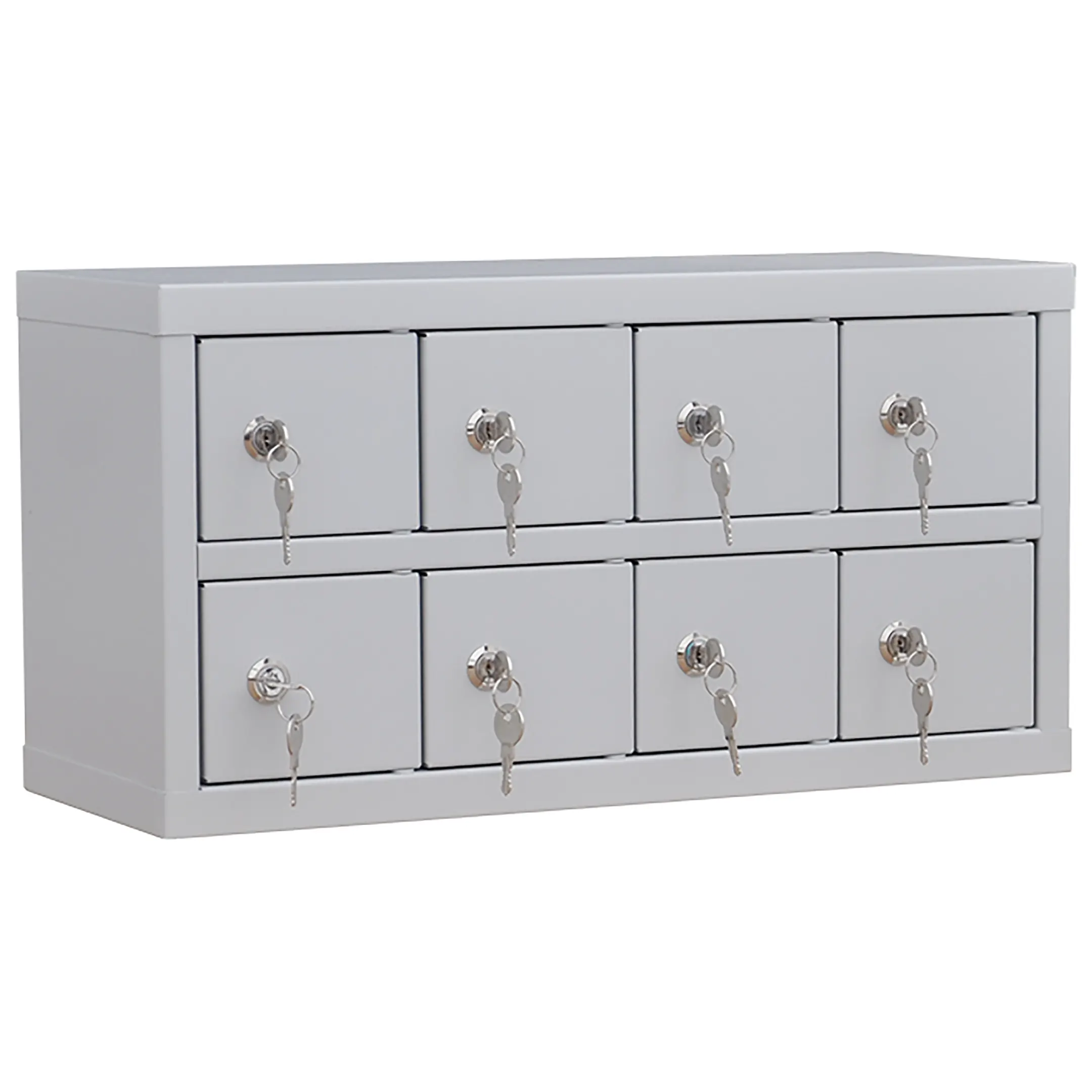 - Максимальная компактность и экономия пространства — шкаф предоставляет 8 индивидуальных запирающихся ячеек, занимая при этом минимальную площадь. Его можно легко разместить на краю рабочего стола, прилавке, полке или в нише, что делает его идеальным для мест, где каждый сантиметр на счету.