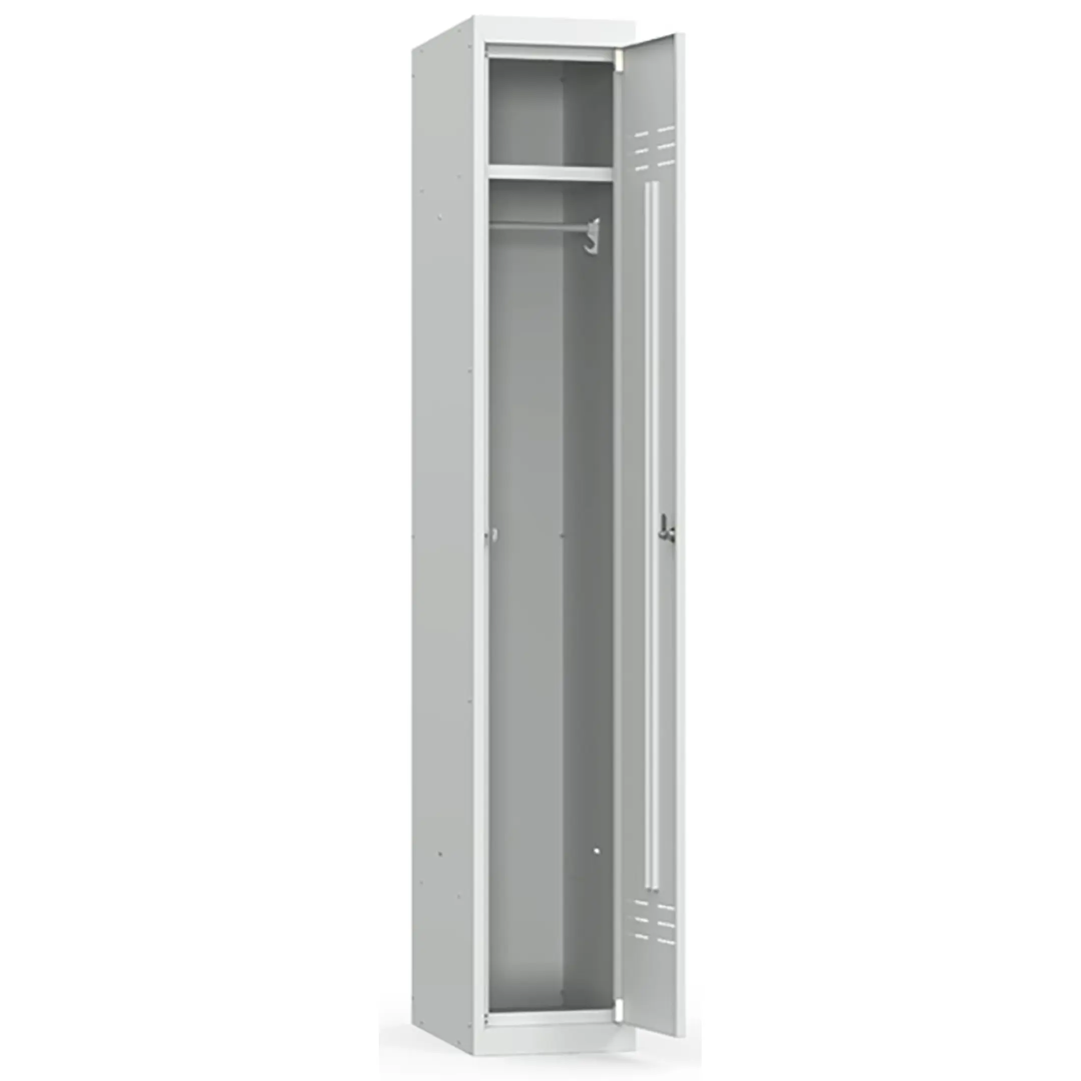 1 секция. 1 ячейка. Полка для головного убора, 2 пластиковых крючка для одежды, пластиковая штанга для вешалки. Отверстие для крепления полок для . Почтовый замок "Euro-Locks". Жалюзи на дверцах. Сборка на заклепках. В комплект поставки входят заклепки. 22 кг, 0,10 куб.м (в упаковке).