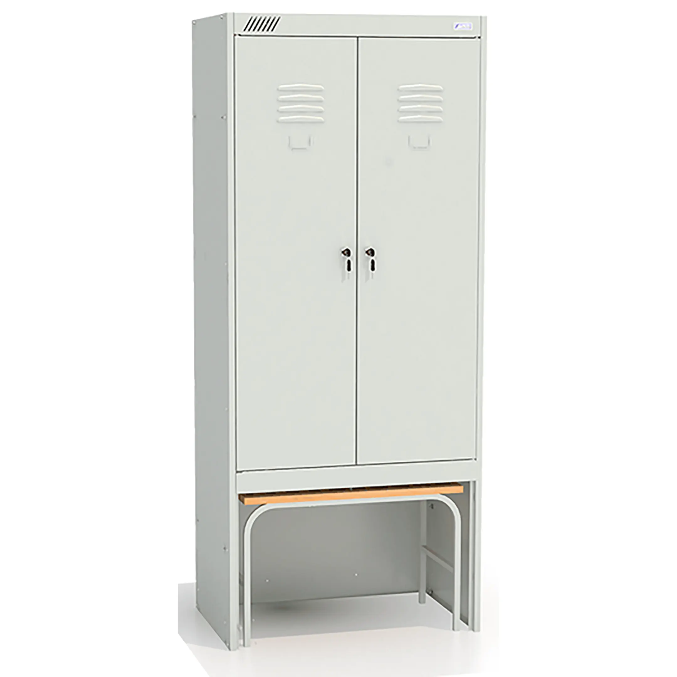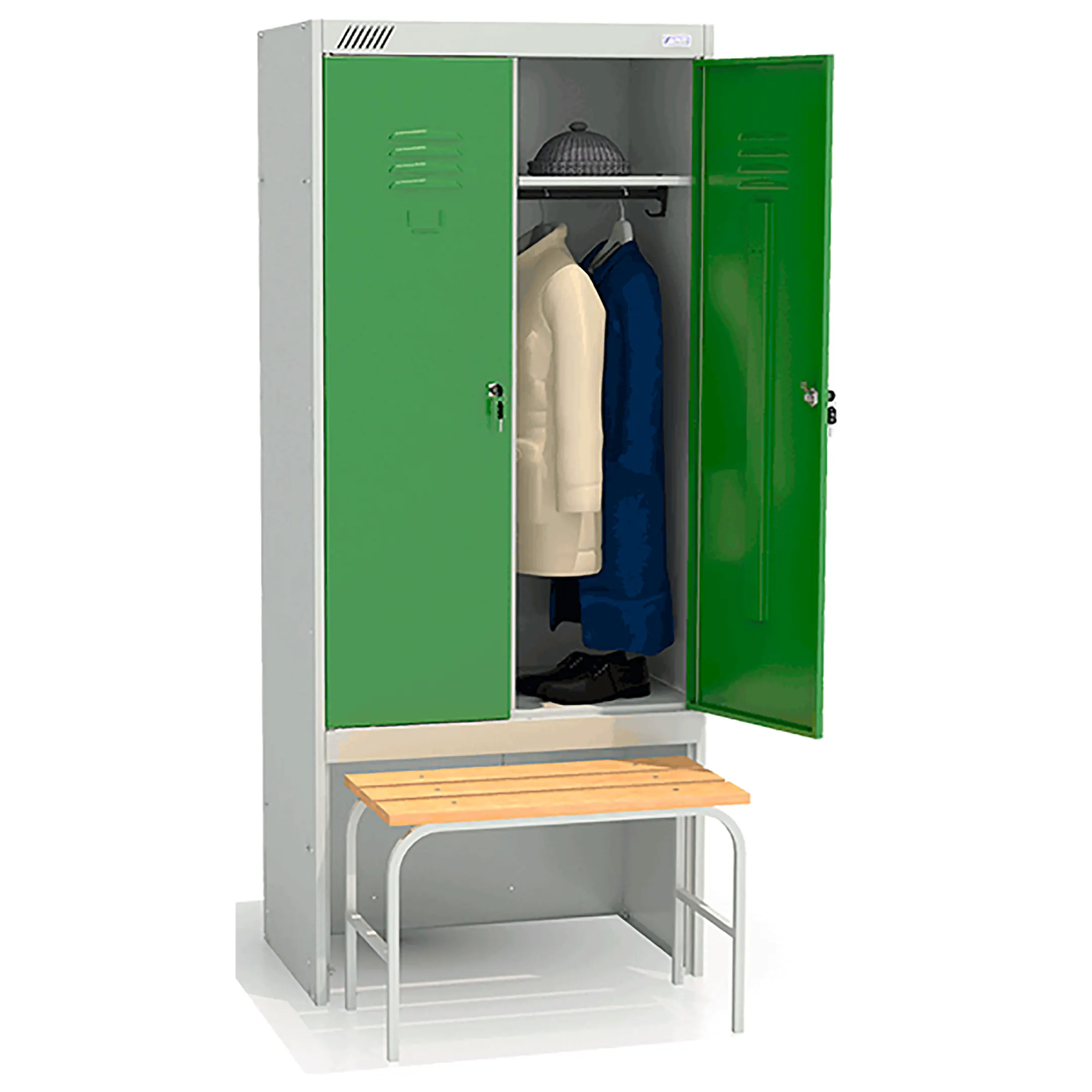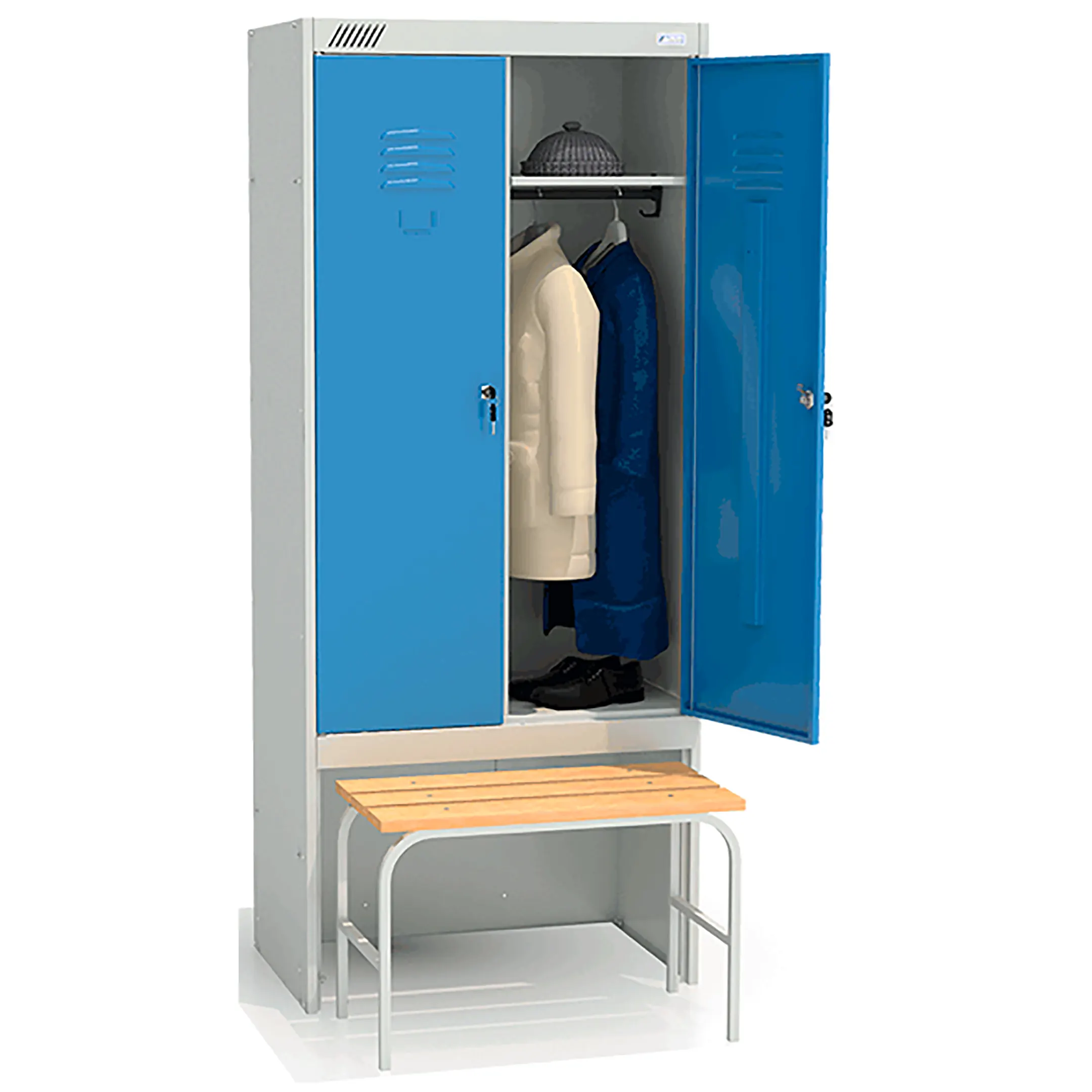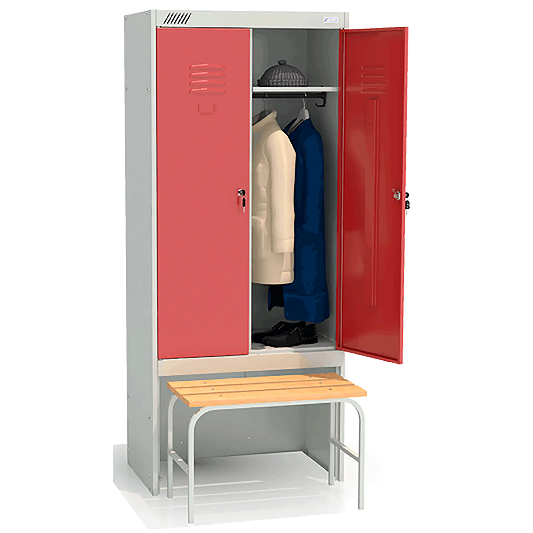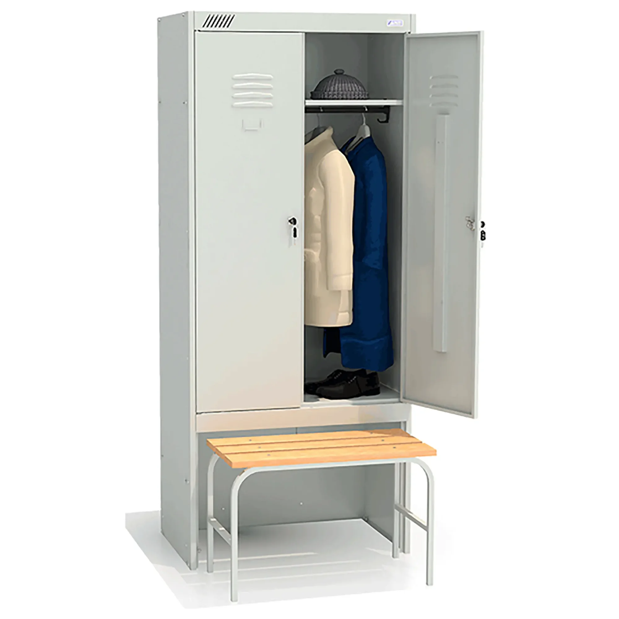 - комплектуется двумя замками повышенной секретности, двумя полками под головные уборы, двумя перекладинами, четырьмя крючками;